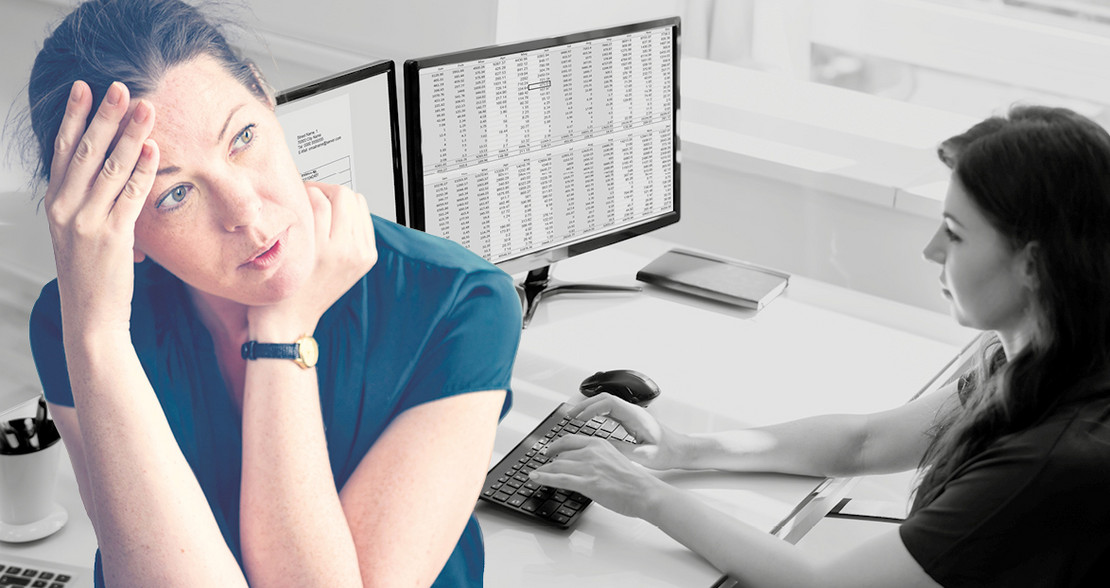 Erschöpfte Frau, im Hintergrund arbeitet eine Frau am Bildschirm