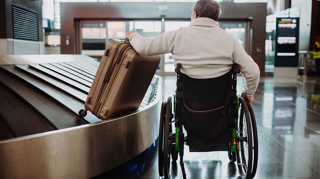 Mann im Rollstuhl nimmt seinen Koffer vom Gepäckband.