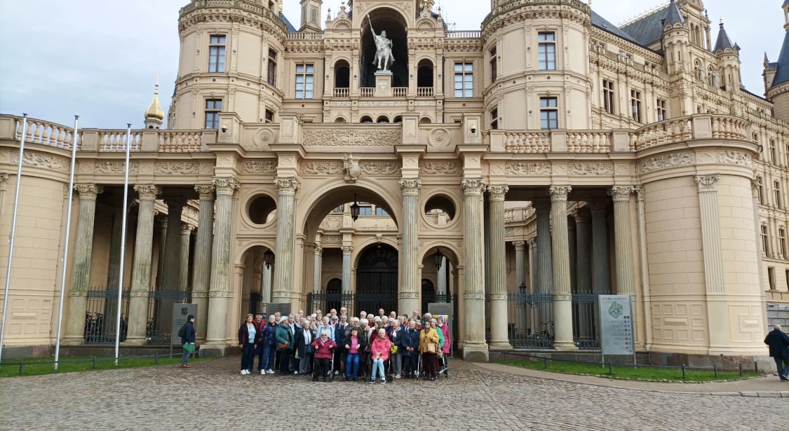 Die Tagesfahrt nach Schwerin mit Besuch des Hofes Kaiser in Salem, dem Stadtbummel in Schwerin und die Besichtigung des Schweriner Schlosses begann zunächst regnerisch, was der Vorfreude keinen Abbruch tat. Es ist halt Oktober und da darf es auch am 08.10.2024 einmal regnen. Aber wir hatten Glück, Petrus meinte es gut mit uns 53 Personen und zum rechten Zeitpunkt wurde es trocken. Im Hof Kaiser wurde uns eine Auswahl von 3 Gerichten angeboten, die Jedermann als köstlich empfand. Das leckere Dessert wurde gerne angenommen. In Schwerin war zunächst Zeit für einen ganz individuellen ausgiebigen Stadtbummel und Besichtigungen, wie der Schloss- und Burggarten, der ganz wunderbar angelegt ist. Der Dom, die Altstadt oder eine schöne Tasse Kaffee in einem bekannten Restaurant, bot sich an.
