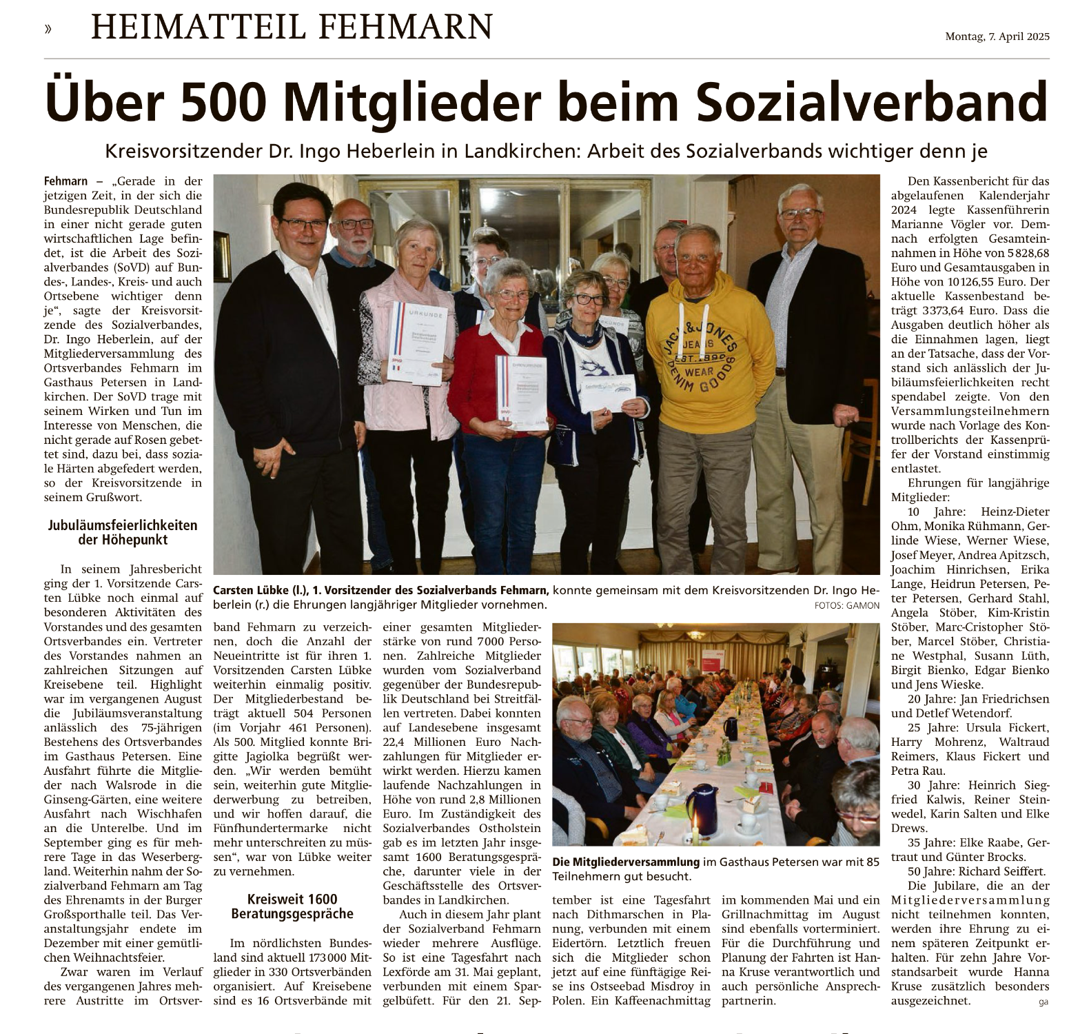 In seinem nachfolgenden Jahresbericht ging der 1.Vorsitzende Carsten Lübke noch einmal auf besondere Aktivitäten des Vorstandes und des gesamten Ortverbandes ein. Einige Vorstandsmitglieder nahmen teilweise an den zahlreichen Sitzungen auf Kreisebene in Eutin und Neustadt teil. Ein Höhepunkt im vergangenen Jahr war das 75-jährige Jubiläum des Ortsverbandes Fehmarn, dass im Gasthaus Petersen im August gemeinsam mit dem Chantychor Großenbrode gefeiert wurde. Die Tagesausfahrt im Frühjahr führte die Mitglieder nach Walsrode in einen Ginseng-Garten und ein weitere Fahrt im September ging in das Kedinger Land an der Unterelbe. Die mehrtägige Reise führte im September in das Weserbergland. Mit der Adventfeier Anfang Dezember endete das Veranstaltungsjahr.