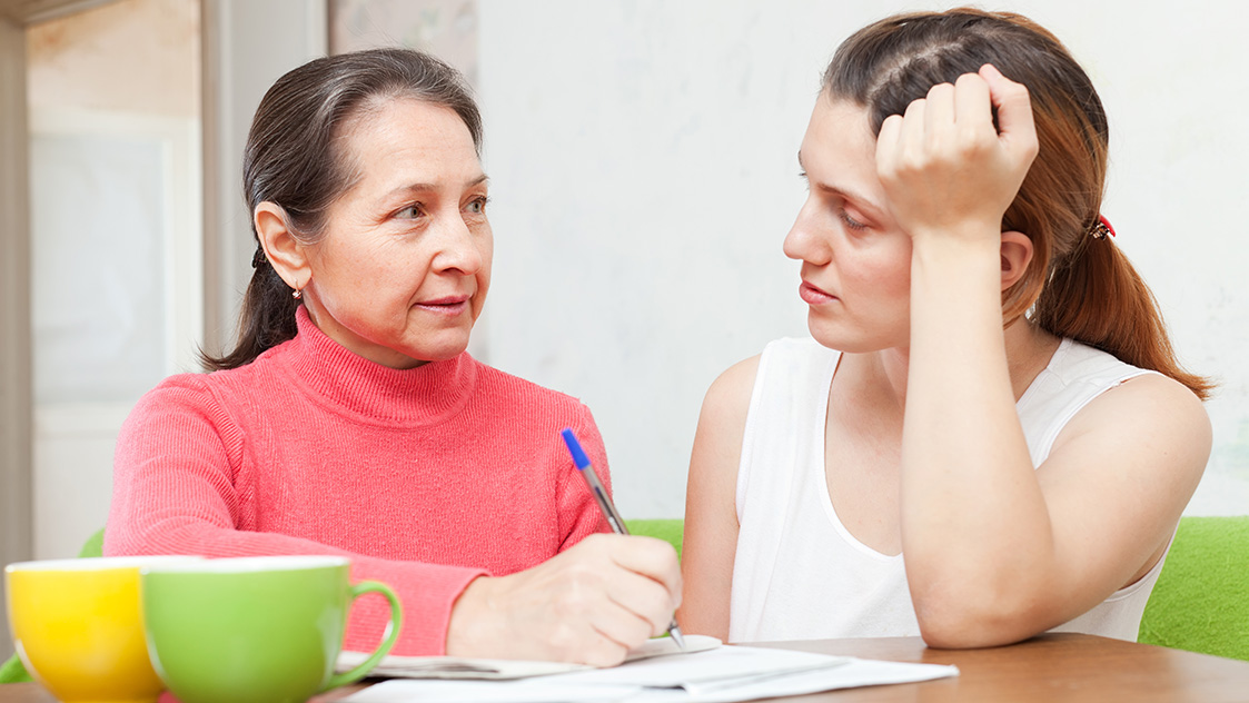 Zwei Frauen sitzen zusammen und füllen ein Formular aus.