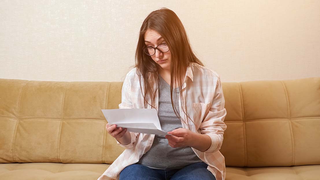 Junge Frau liest besorgt einen Brief.