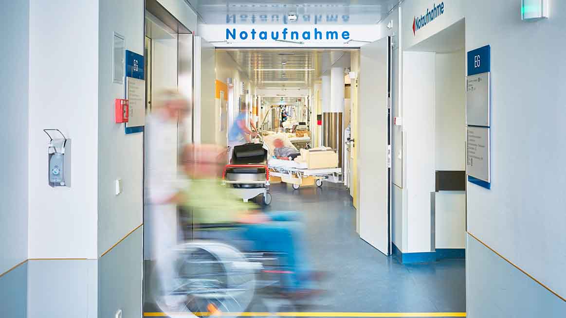 Eingangsbereich einer Notaufnahme. Im Vordergrund wird ein Rollstuhl geschoben.