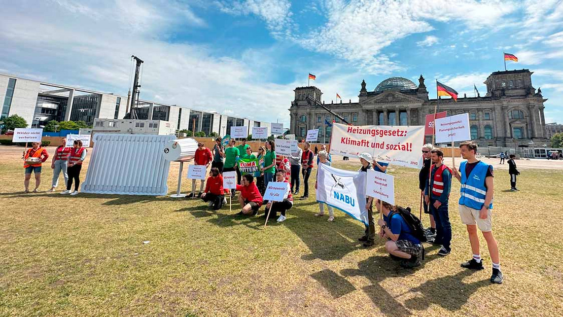 Am Donnerstag entscheidet der Bundestag über das Gesetz. Um auf die sozialpolitischen Leerstellen beim geplanten Gebäudeenergiegesetz und die drohendende Verfehlung der Klimaschutzziele aufmerksam zu machen, demonstrierten der SoVD und andere Organisationen (NABU, Paritätischer Gesamtverband, Campact, Deutsche Umwelthilfe, BUND) vor dem Berliner Reichstag. Zur Verdeutlichung ihrer Positionen wurde ein übergroßes Heizungsventil symbolisch von „Fossil“ auf „Erneuerbare“ gedreht.
