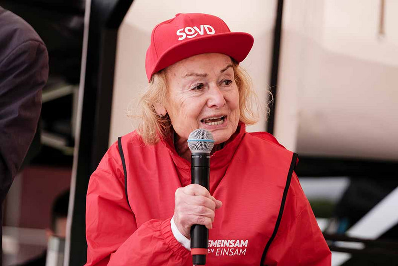 Menschen in roter Kleidung und einem Plakat mit dem SoVD-Logo.