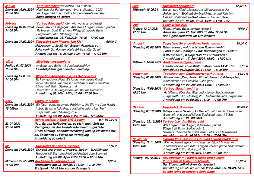 Als Anlauf- und Kontaktstelle für Mitglieder und für Interessierte bieten wir in ehrenamtlicher Regie regelmäßige Zusammenkünfte, Informationsveranstaltungen mit sozialpolitischem Inhalt, allgemeine Vorträge, gemütliche Runden und Feiern, Tages- und Mehrtagesfahrten und noch einiges mehr an. Das Motto unseres Ortsverbandes in Eutin lautet „gemeinsam statt einsam“.
